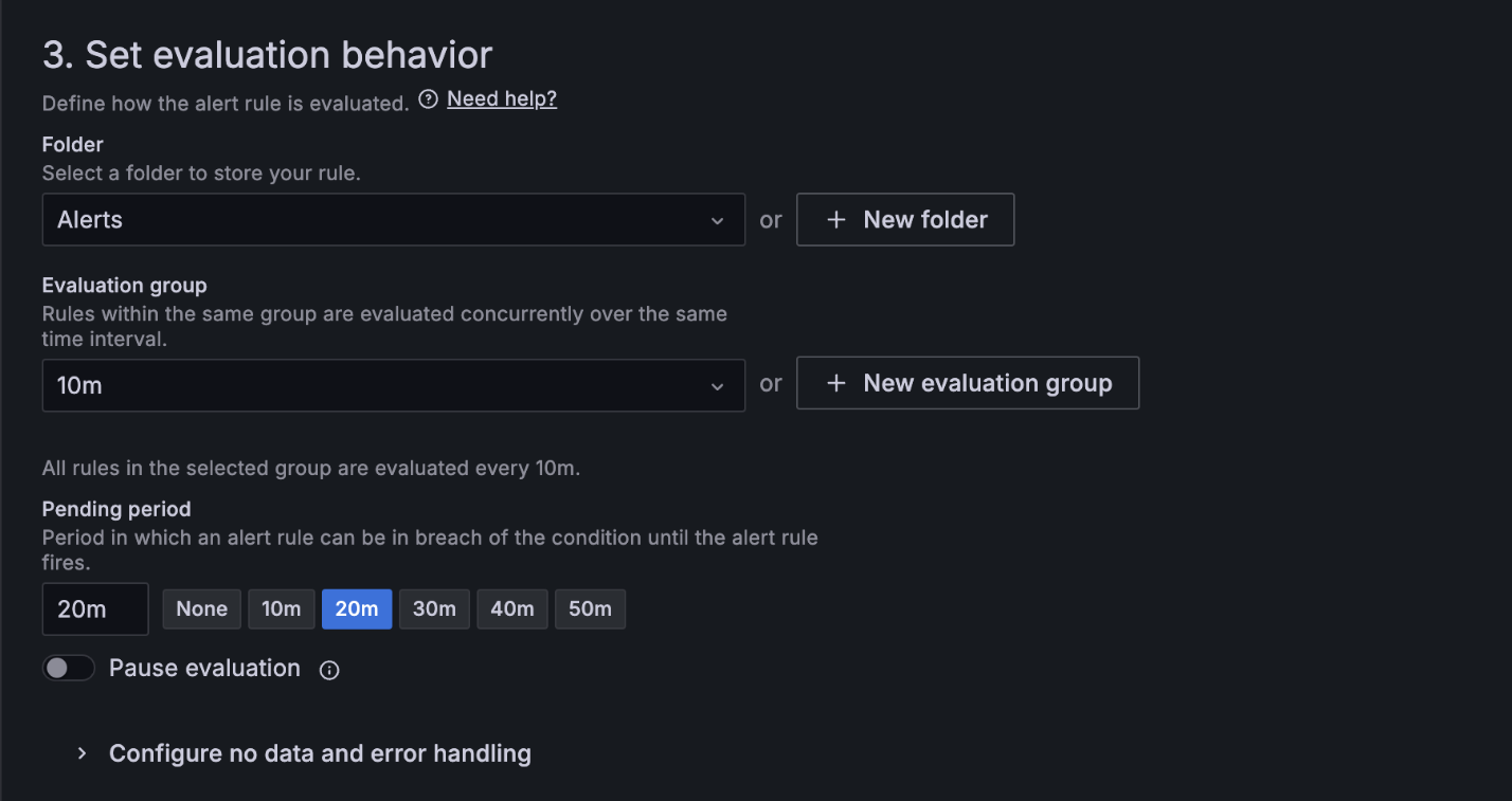 Каждая группа оценки содержит интервал оценки, который определяет, как часто проверяется правило оповещения. Например, оценка может выполняться каждые 10s, 30s, 1m, 10m и т. д.
