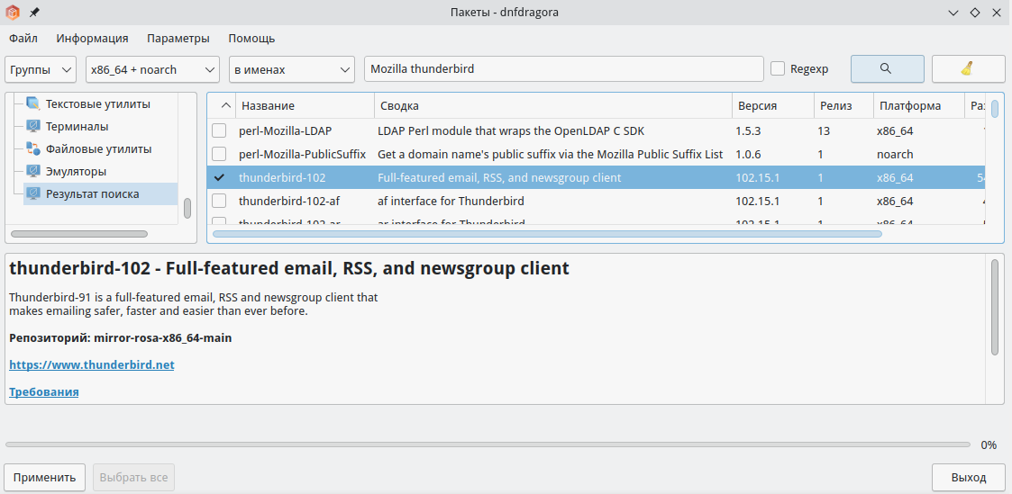 В открытом окне утилиты "Пакеты" наберите название пакета, который необходимо установить, в данном случае - Mozilla Thunderbird. Далее в результатах поиска выберите необходимый пакет почтового клиента (Рисунок 49).