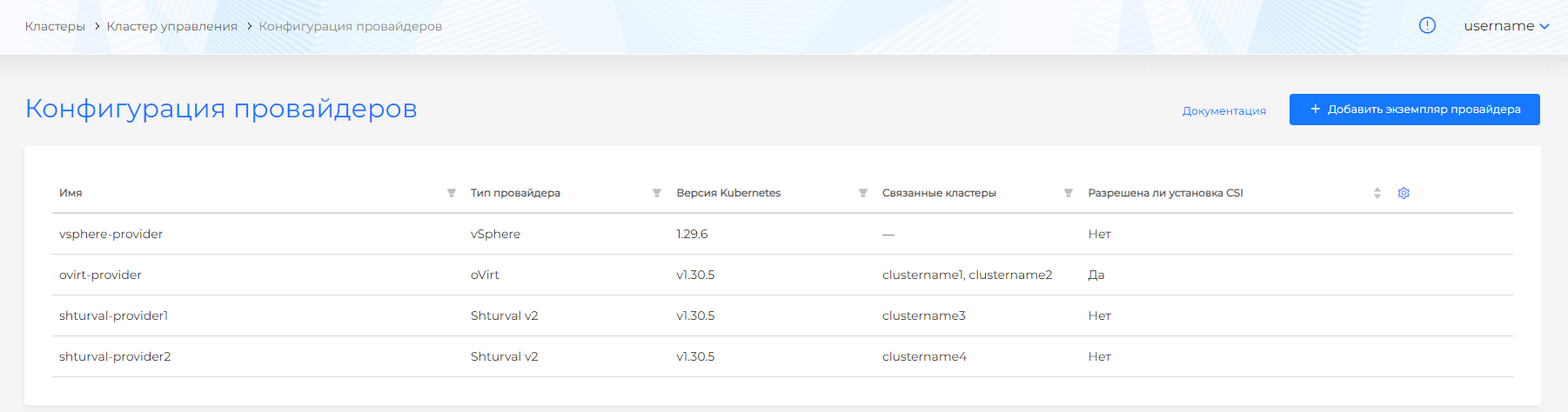 Следует обратить внимание, что экземпляр провайдера, с которым инсталлирован кластер управления, не должен использоваться при создании клиентских кластеров.