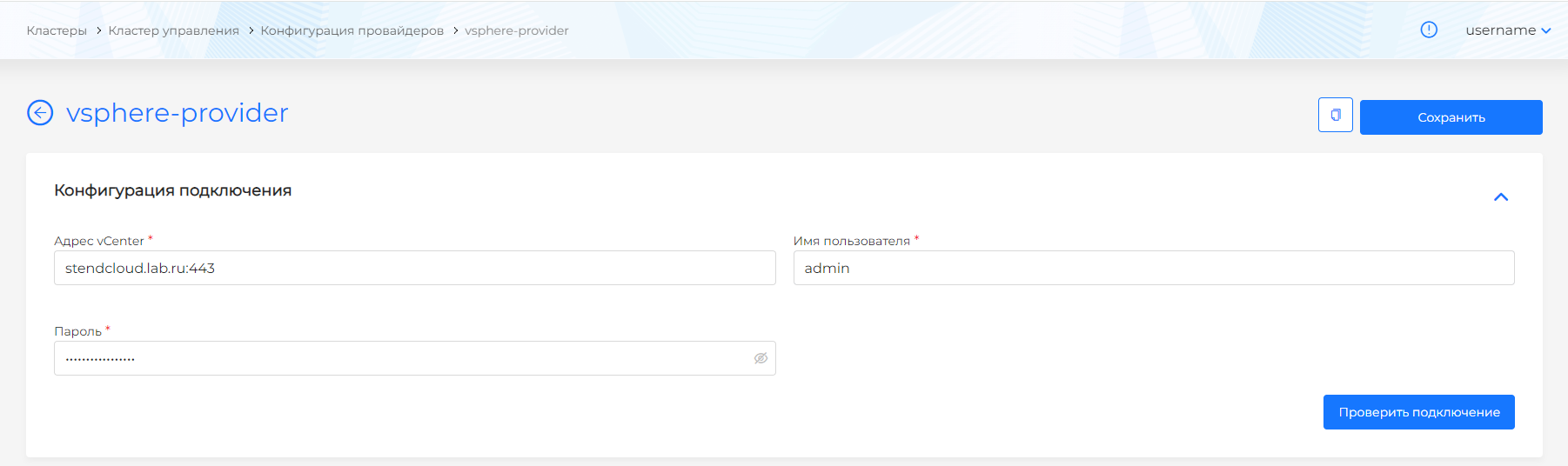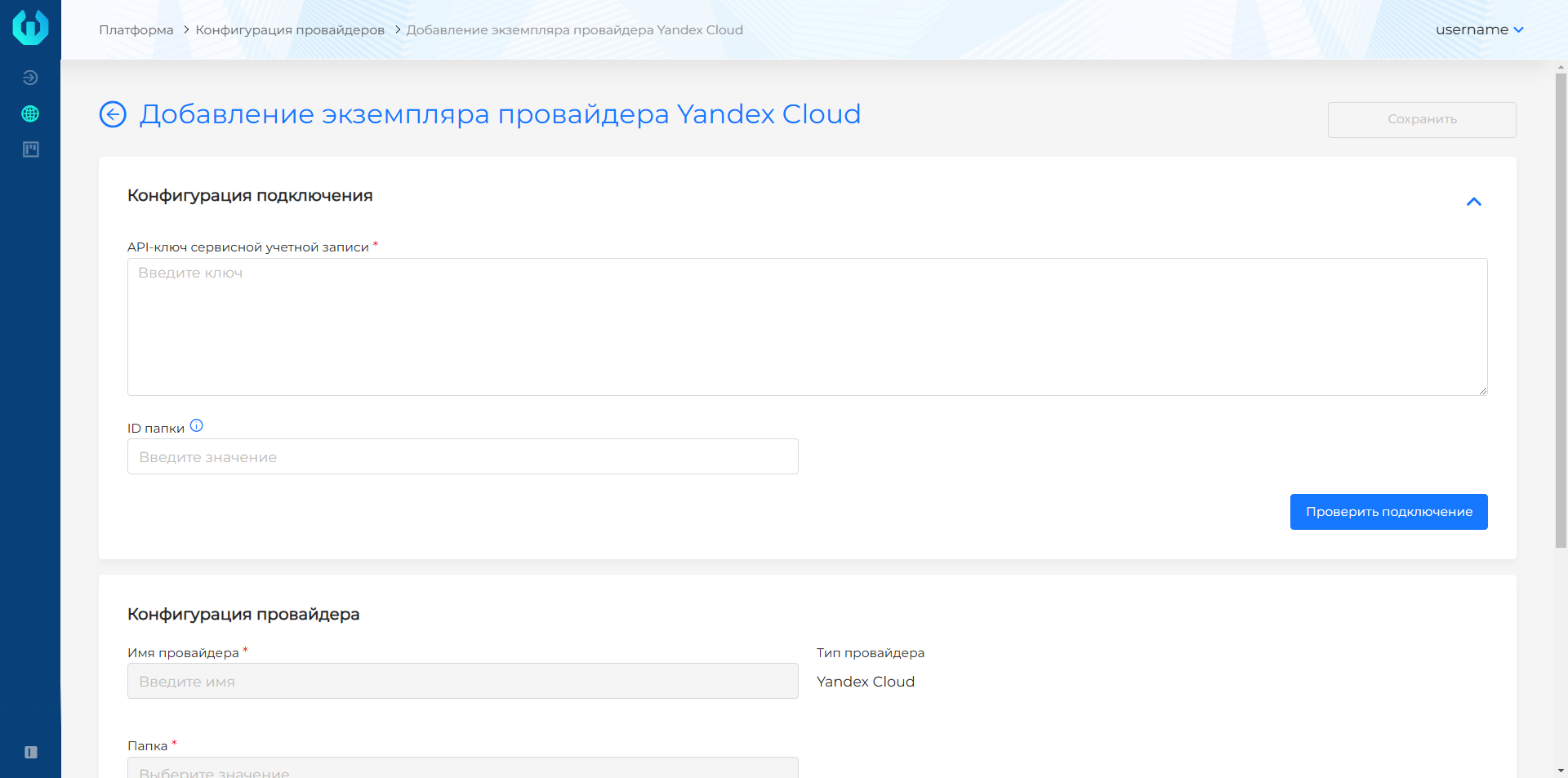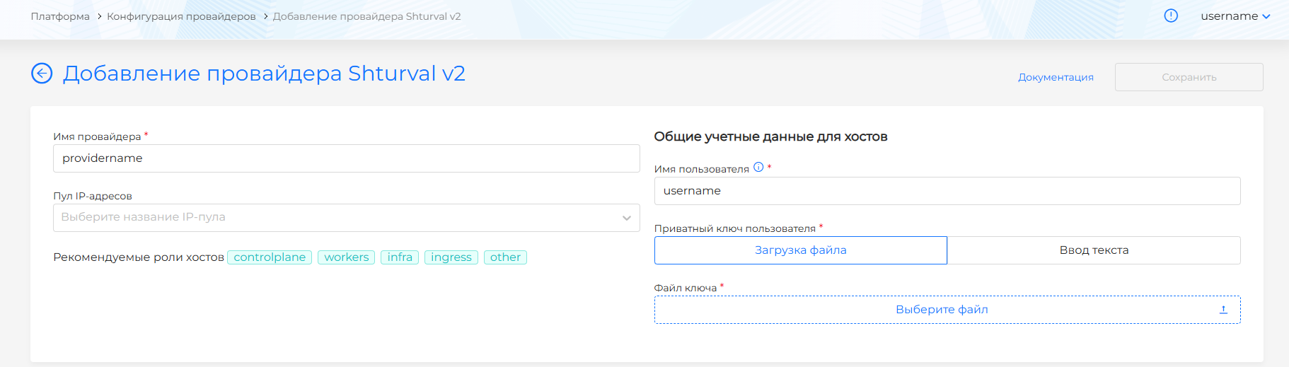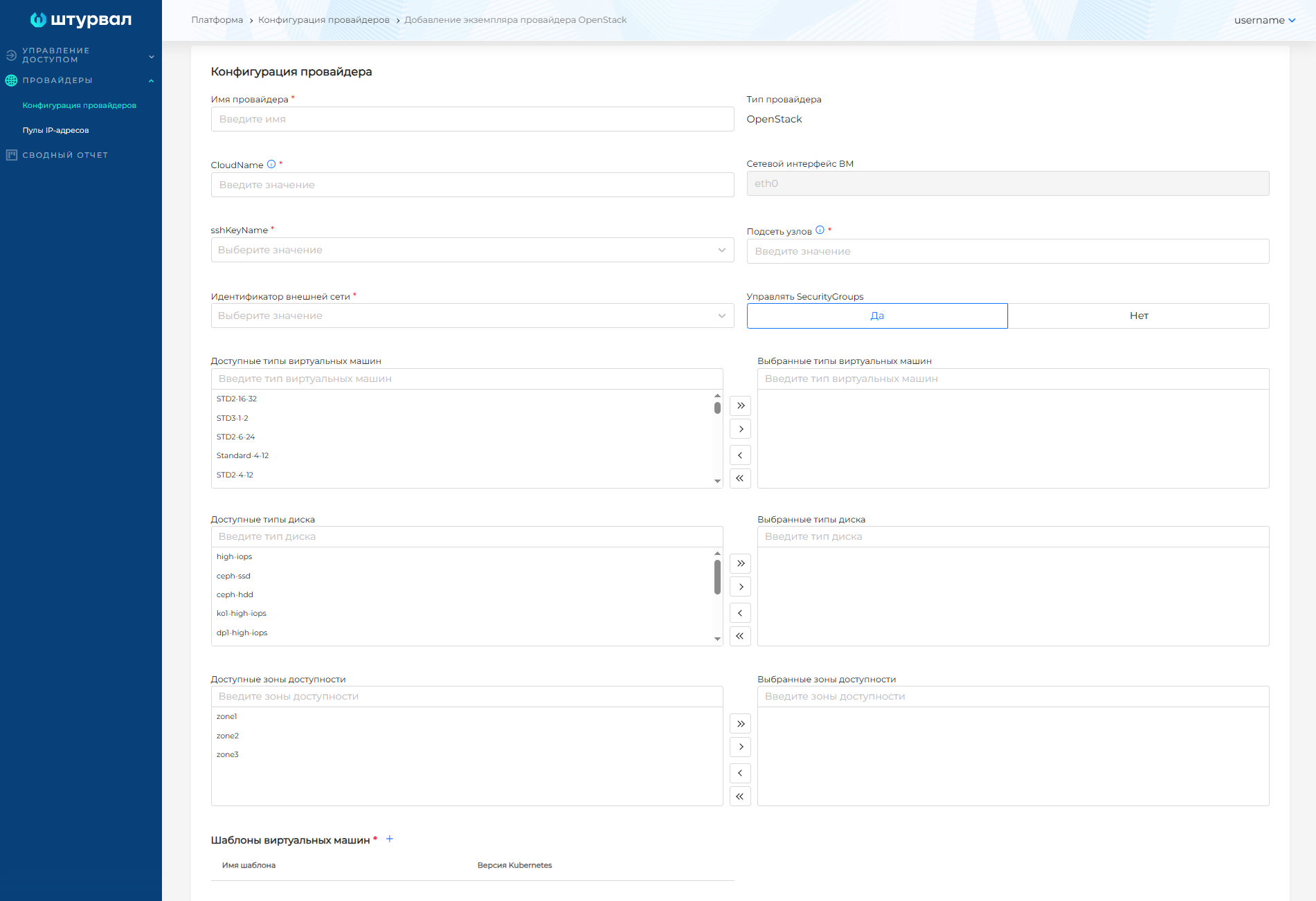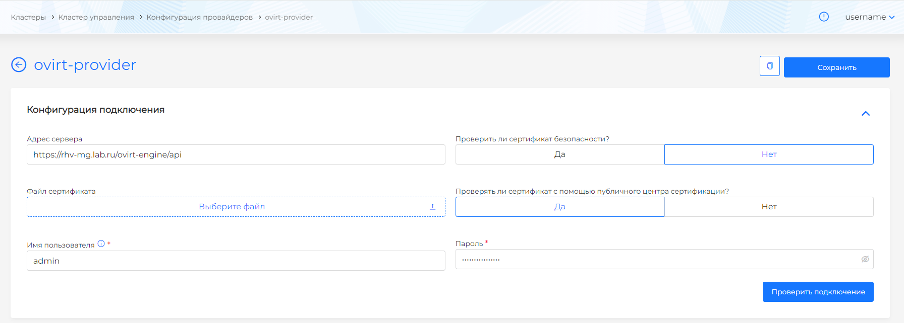 - задать "Имя провайдера" (будет использоваться для выбора шаблона при создании кластера);