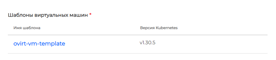 - в блоке "Шаблоны виртуальных машин" добавить шаблоны, созданные в платформе виртуализации. Для одной версии Kubernetes доступно добавление только одного шаблона ВМ (рисунок 64).