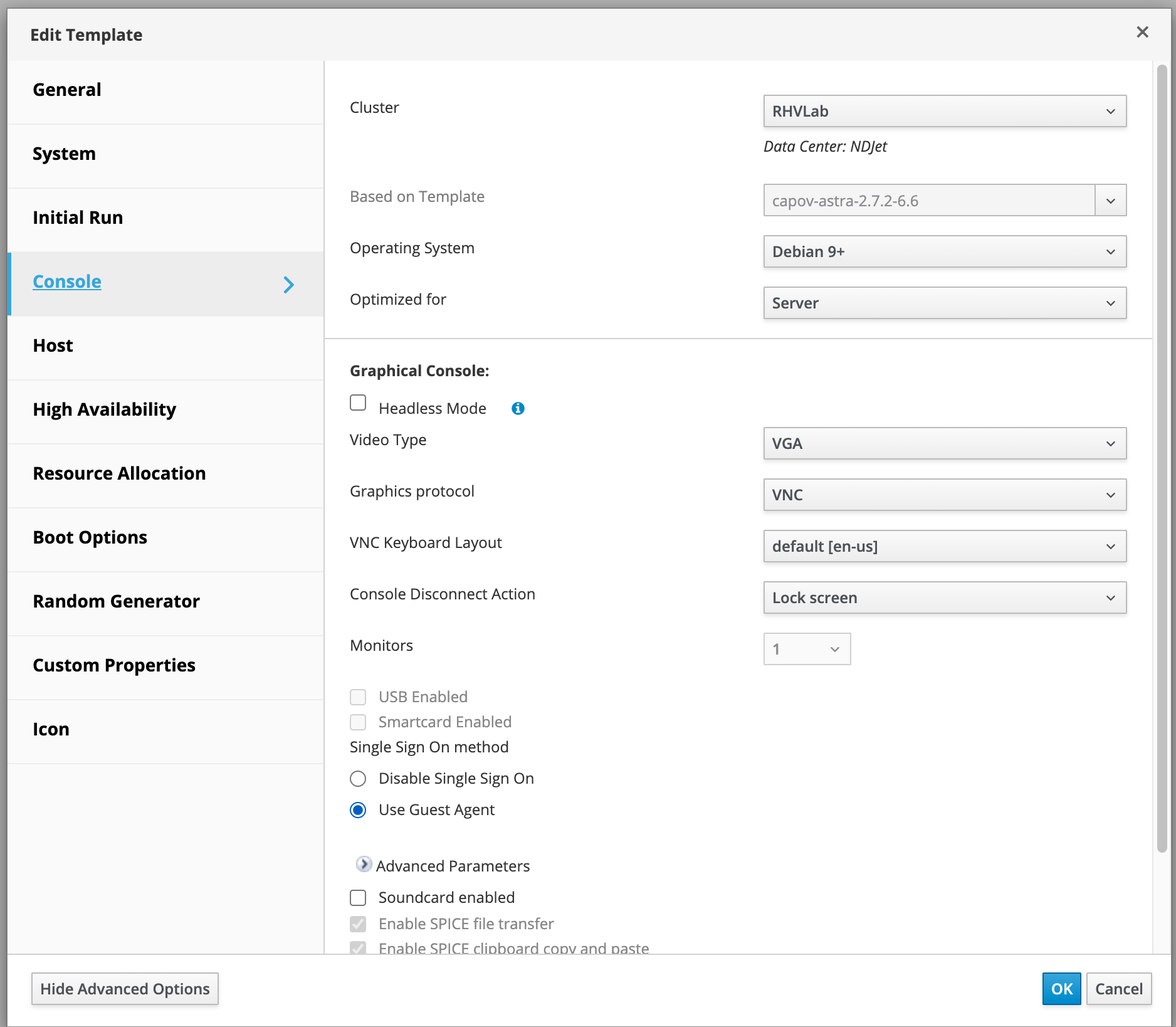 Примечание ‒ В случае поднятия на RHV шаблона ВМ с ОС Astra Linux 1.8 с ядром 6.6 обнаружено, что загрузка ВМ может останавливаться в случайном месте. Это происходит из-за проблем с драйвером qxl. Для решения проблемы необходимо в шаблоне ВМ изменить тип видеокарты (консоли) на VGA (именно после создания шаблона, из ВМ в шаблон эта настройка не переходит) (рисунок 53).