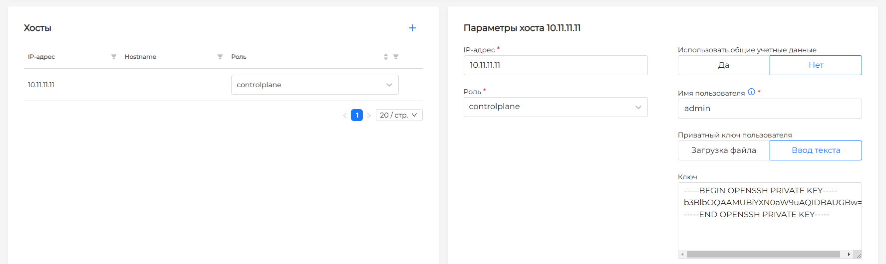 - Приватный ключ пользователя ‒ загрузить файл с данными ключа или указать ключ текстом.