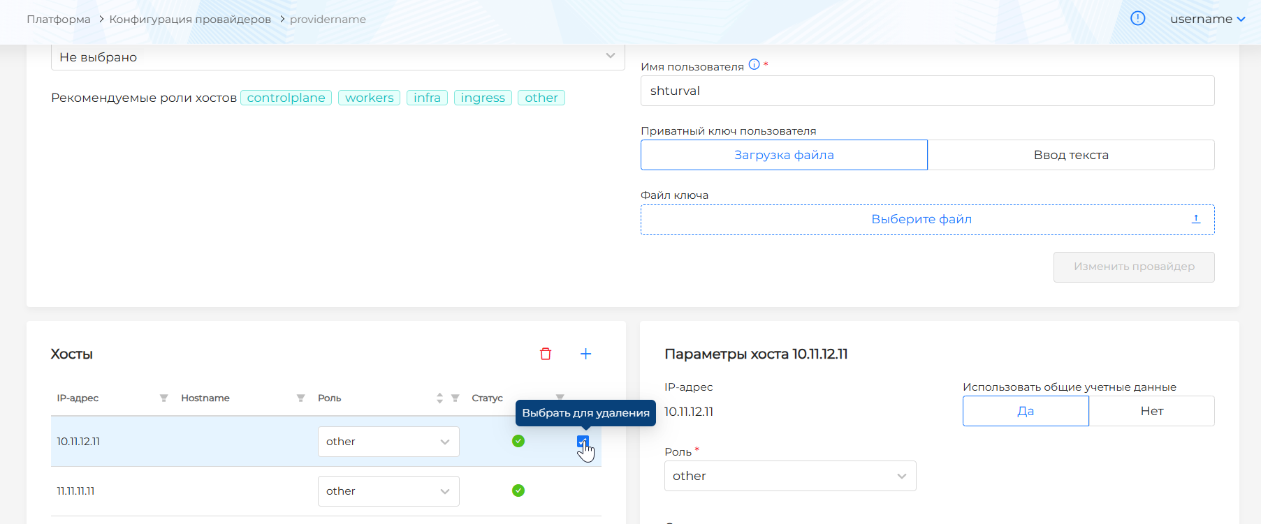 Далее можно приступать к добавлению хостов. В левой нижней части экрана будут отображены хосты, в правой ‒ данные добавляемого или просматриваемого хоста. Есть возможность добавления нескольких хостов. Валидация данных будет происходить после инициализации сохранения провайдера.
