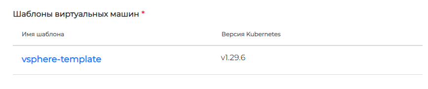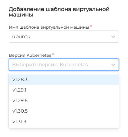 Следует обратить внимание, что указанная версия Kubernetes в шаблоне ВМ определяет доступные для выбора версии Комплекса при создании клиентских кластеров.
