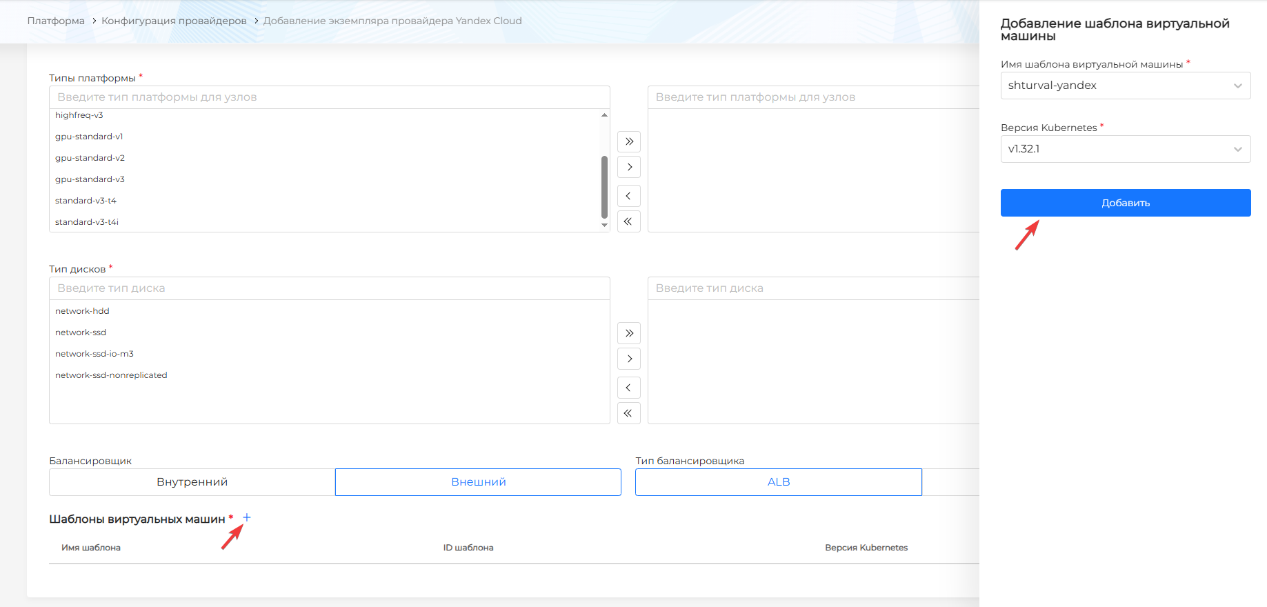 Подробнее о добавлении шаблона ВМ в экземпляр провайдера и выборе версии Kubernetes см. в п. Загрузка шаблона ВМ в Комплекс.