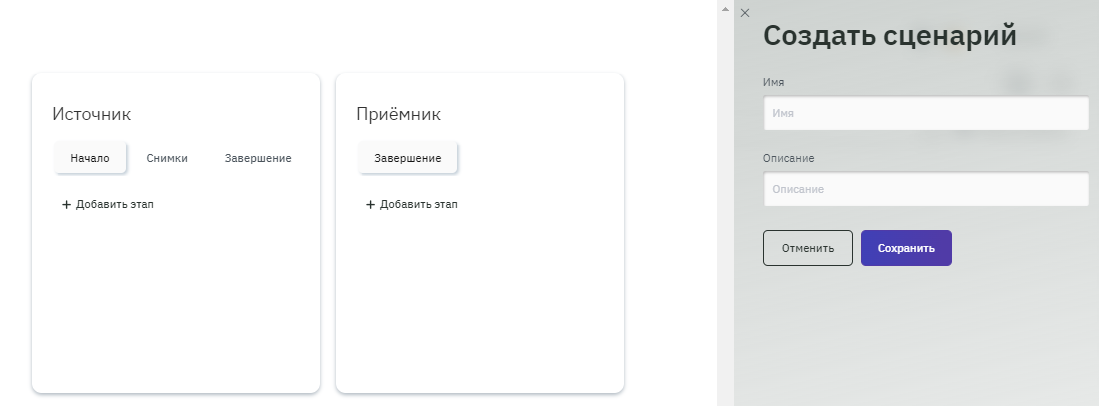 В разделе "Скрипты" Пользователь может добавить дополнительные индивидуальные наборы команд или инструкции для выполнения на источнике или приемнике на разных этапах миграции.
