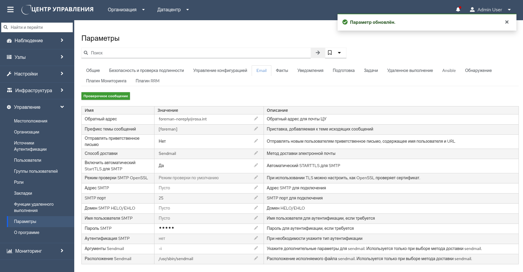 Для подключения РОСА Центр управления к внешнему почтовому SMTP-серверу необходимо перейти в меню "Управление → Параметры" панели навигации и во вкладке "Email" указать необходимые значения для следующих параметров (рисунок 18):