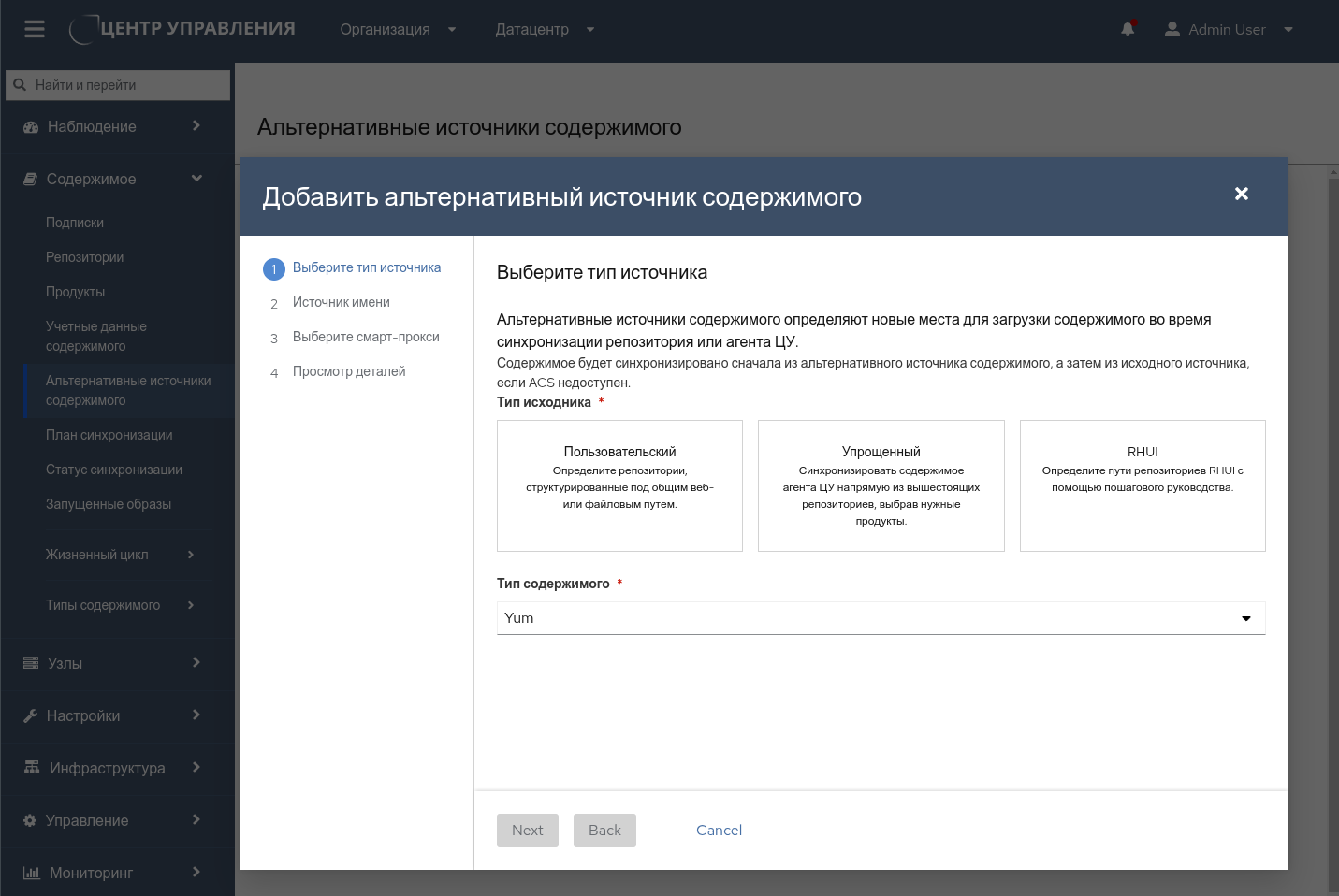 В рабочем окне "Добавить альтернативного источника содержимого" нужно по шагам, следуя кнопкам Next и Back, выбрать тип источника, тип содержимого, ввести имя и описание, выбрать смарт-прокси, ввести базовый путь, выбрать вариант аутентификации, проверить указанные параметры и нажать кнопку Добавить (рисунок 118).