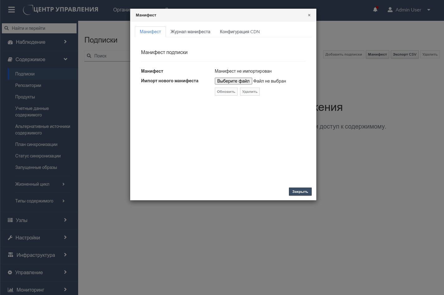 Примечание – Если удалить манифест с клиентского портала Red Hat или в веб-интерфейсе Комплекса, все права для всех узлов содержимого будут удалены.