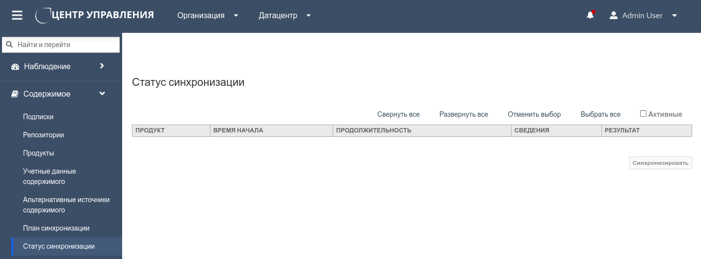 Для наблюдения за выполнением планов синхронизации можно воспользоваться пунктом меню "Содержимое → Статус синхронизации", в рабочей области которого в табличном виде перечислены все продукты, по которым проводилась или проводится в текущий момент синхронизация, с указанием времени начала, продолжительности, сведений о статусе и результатов (рисунок 123).