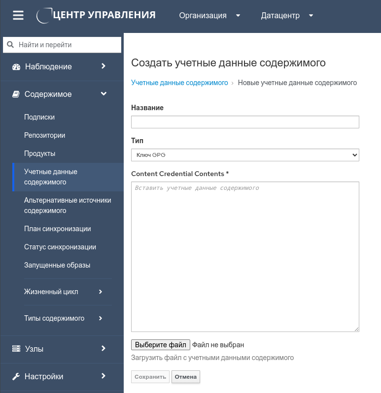 - в поле "Содержание учетных данных" вставить GPG-ключ или нажмите кнопку