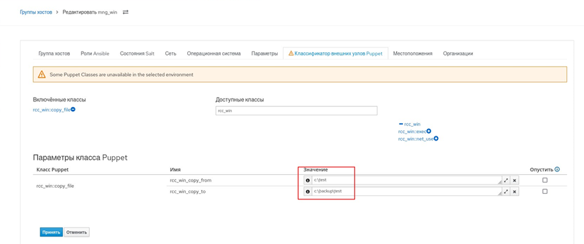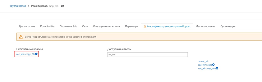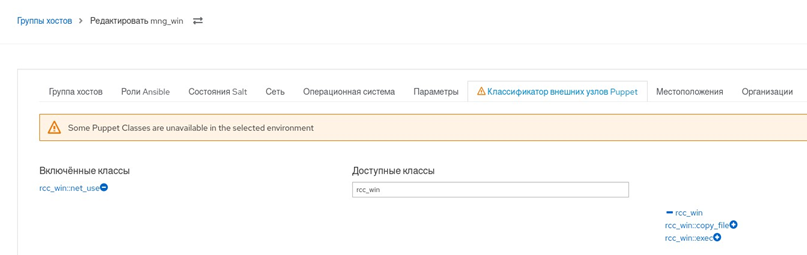 - перейти в пункт меню "Настройка → Группы узлов" и на вкладке "Классификатор узлов Puppet" в созданную группу добавить класс rcc_win:exec;