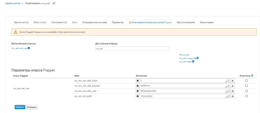 - перейти в пункт меню "Настройка → Группы узлов" и на вкладке "Puppet ENC" в созданную группу добавить класс rcc_win:net_use (рисунок 52);