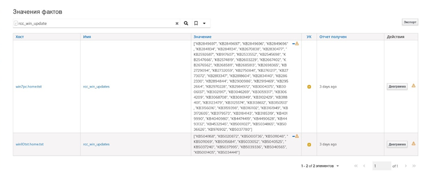 Для того чтобы посмотреть установленные на АРМ обновления Windows, нужно зайти в пункт меню "Наблюдение → Факты", найти и выбрать факт rcc_win_update, после чего отобразится список АРМ с установленными на них обновлениями ОС Windows (рисунок 56).