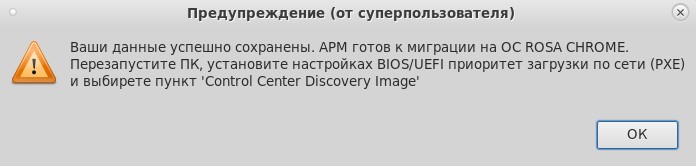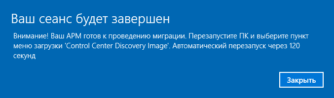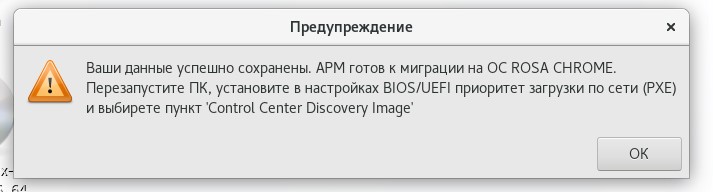 - после перезагрузки автоматизированное сохранение пользовательских данных и снимка "образа" ОС узла, по окончании которого будет выдано сообщение "Внимание! Ваш АРМ готов к проведению миграции. Перезапустите ПК и выберите пункт меню загрузки 'Control Center Discovery Image'. Автоматический перезапуск через 120 секунд" (можно инициировать перезагрузку вручную) (рисунок 60);