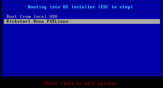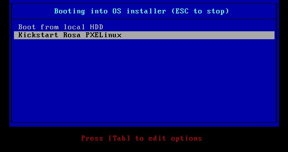 - АРМ начнет перезагрузку, после чего опять должен загрузиться по сети (PXE); для дальнейшей установки ОС выбрать пункт "Kickstart Rosa PXElinux" (для режима MBR/Legacy BIOS) (рисунок 97);