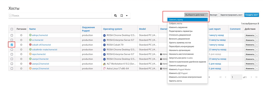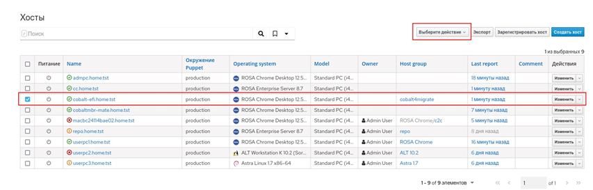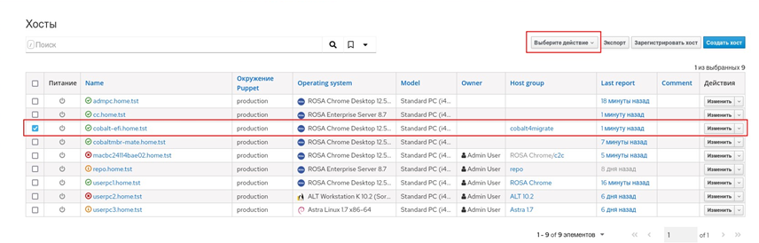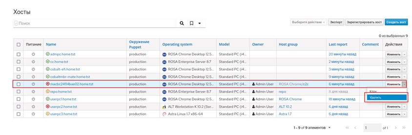 После выполненных шагов АРМ включен в домен, и можно входить как под доменной УЗ, так и под УЗ локального пользователя. Клиент puppet-agent уже настроен и работает с ключами от АРМ до миграции. На сервере Комплекса он будет присутствовать в списке узлов под старым именем (рисунок 101).