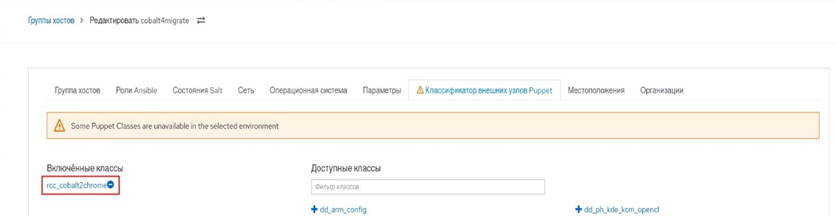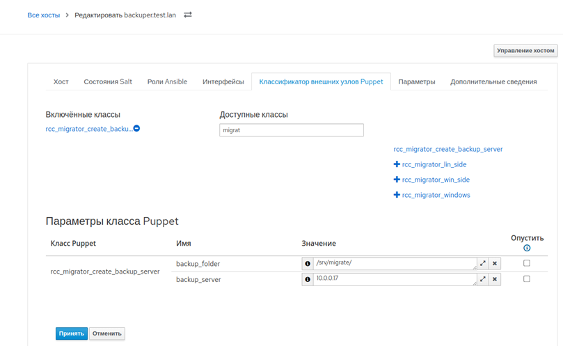 Изменитьв столбце "Действия"; - на вкладке "Puppet ENC" из перечня "Доступные классы" перенести класс rcc_migrator_create_backup_server во "Включенные классы" (рисунок 57);