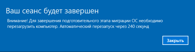 - автоматизированная очистка дискового пространства узла от вспомогательных, системных и других файлов для оптимизации скорости миграции и размера при создании "образа" сохраняемых данных, по окончании которого будет выдано сообщение "Внимание! Для завершения подготовительного этапа миграции ОС необходимо перезагрузить компьютер. Автоматический перезапуск через 240 секунд" (можно инициировать перезагрузку вручную) (рисунок 59);