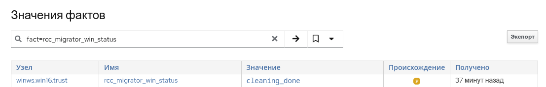 Примечание – Получить статус выполнения заданий по очистке и резервному копированию АРМ под управлением Windows возможно обратившись к факту fact=rcc_migrator_win_status (рисунок 61), воспользовавшись веб-интерфейсом Комплекса.