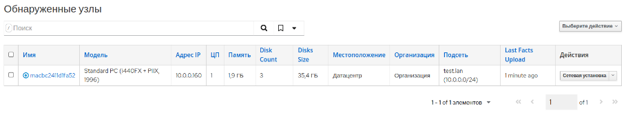 - данные об обновленном узле передаются в Комплекс; нужно перейти в меню "Узлы → Обнаруженные узлы" и убедиться, что появился новый узел (рисунок 65), который необходимо в дальнейшем мигрировать;