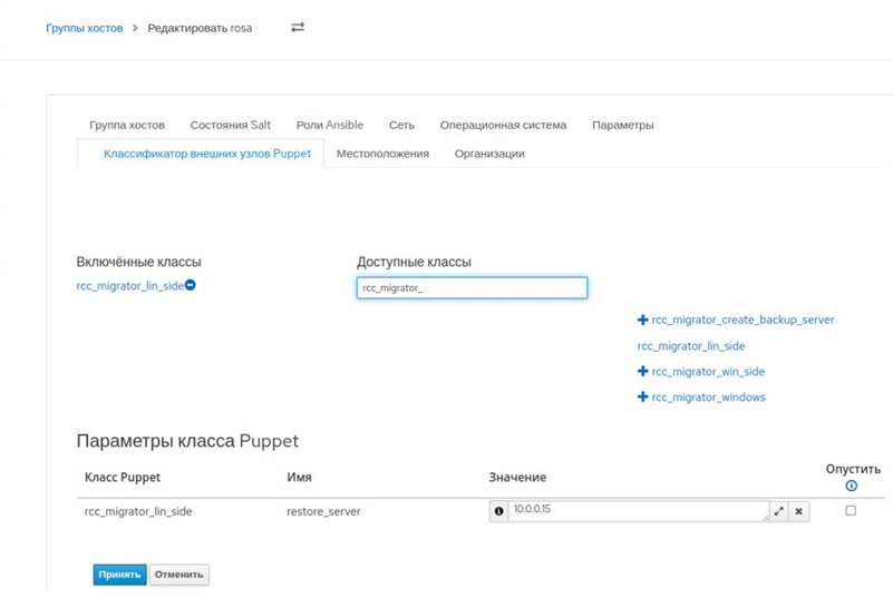 Изменитьв столбце Действия; - на вкладке "Puppet ENC" из перечня "Доступные классы" перенести класс rcc_migrator_win_side во "Включенные классы", в котором можно настроить параметры для Windows-части миграции (рисунок 58):