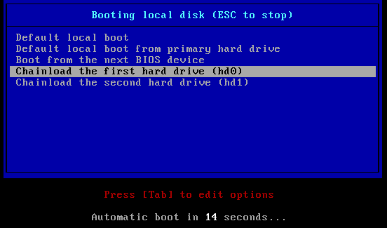- после установки появится меню (рисунок 69), в котором для локальной загрузки нужно выбрать пункт "Default local boot" для работы с мигрированным узлом;