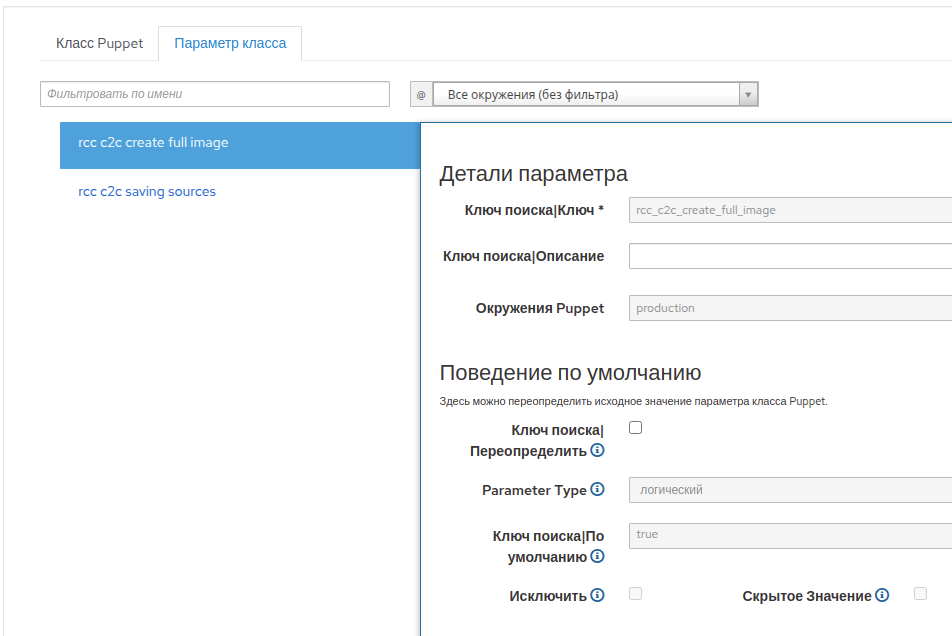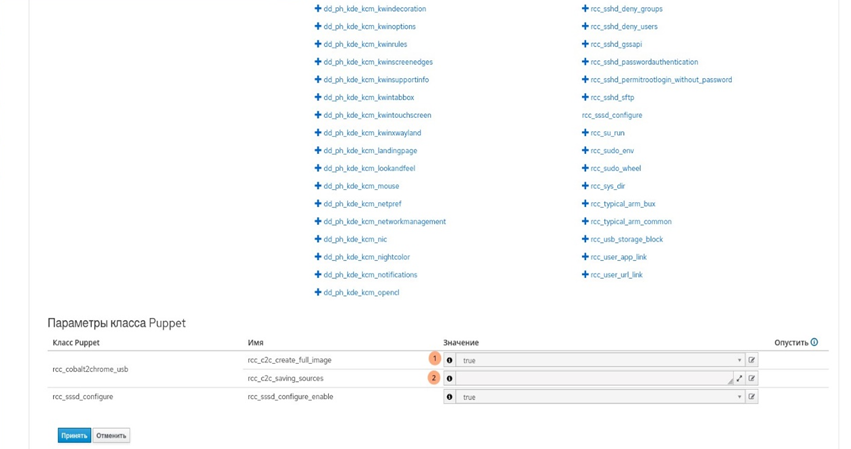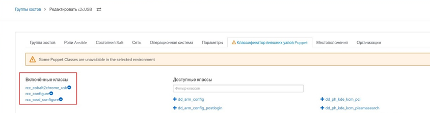 - изменить параметры класса для самой группы, для чего открыть пункт меню "Настройки → Группы узлов", выбрать нужную группу (в данном случае c2cUSB), перейти на вкладку "Puppet ENC", перейти к секции "Параметры класса Puppet" внизу страницы для изменения, внести изменения и нажать кнопку