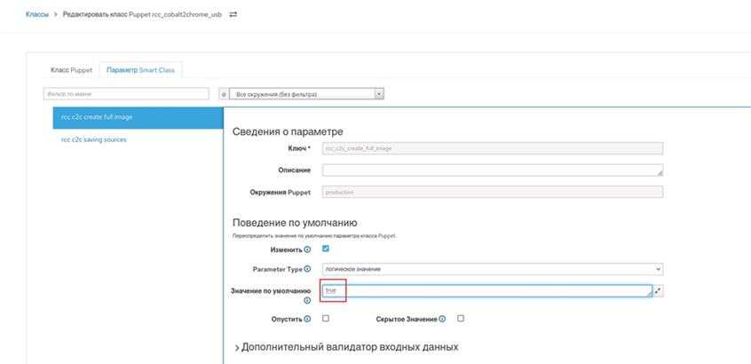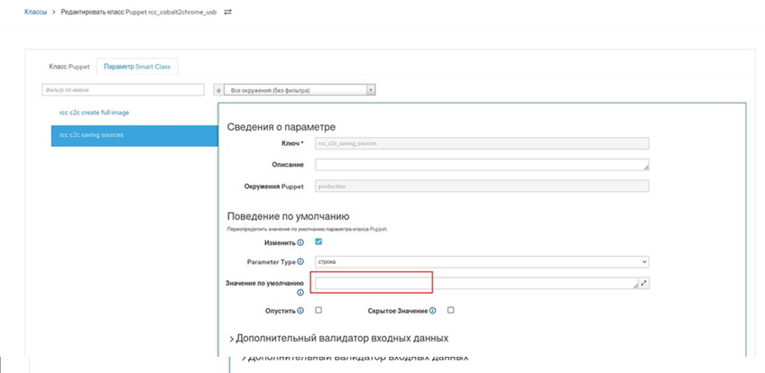 rcc_cobalt2chrome_usb, для чего выбрать пункт меню "Настройки → Puppet ENC → Классы", найти и выбрать этот класс, перейти на вкладку "Параметр класса" для настройки смарт-класса (рисунок 87);