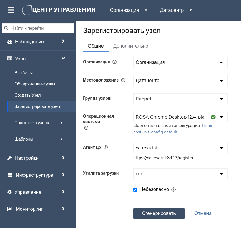Выбор ОС должен соответствовать фактически установленной на узел операционной системе, так как в зависимости от указанной версии шаблоны подготовки генерируют различные скрипты регистрации, учитывающие доступные репозитории, версии пакетов программ и прочие специфические аспекты. Таким образом, скрипты регистрации, сгенерированные для одной ОС, в общем случае не могут быть использованы для другой ОС.