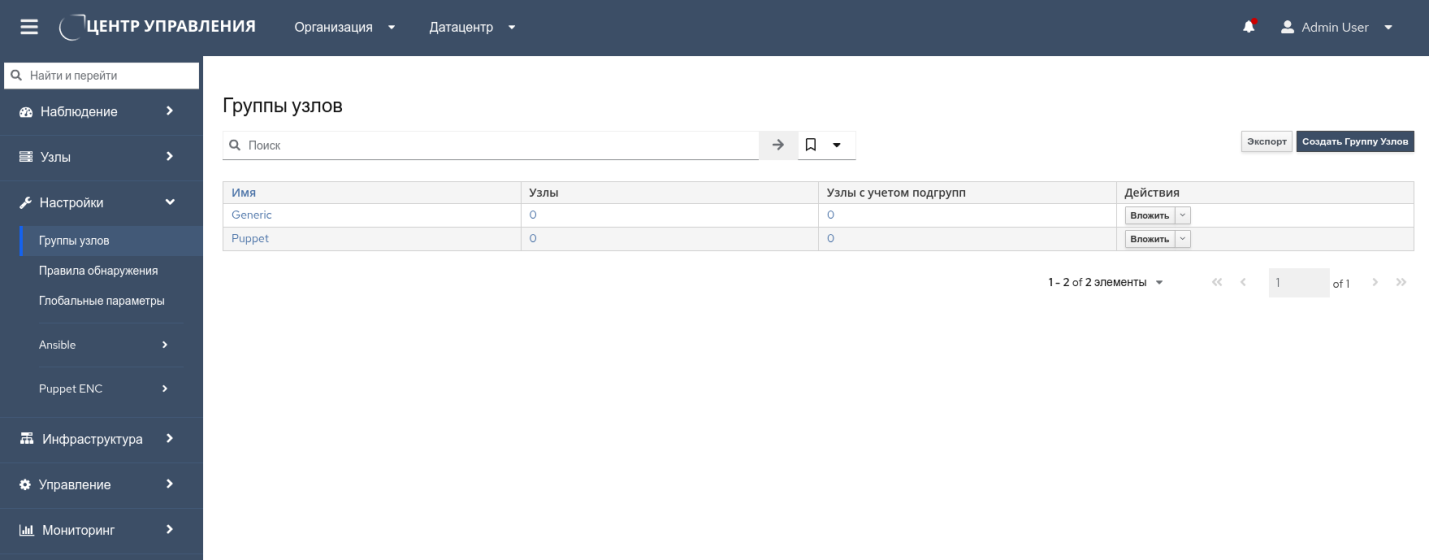Также заполняют всю информацию, относящуюся к группе, на вкладках "Роли Ansible", "Сеть", "Операционная система", "Параметры", "Puppet ENC", "Местоположения", "Организации", "Ключи активации".