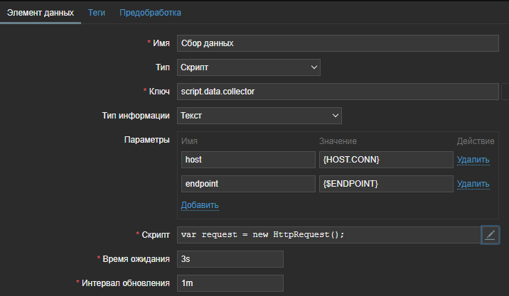 Скриптовые элементы данных можно использовать для сбора данных путем выполнения пользовательского JavaScript-кода с возможностью получения данных через HTTP/HTTPS. В дополнение к скрипту можно указать опциональный список параметров (пары из имени и значения) и время ожидания.