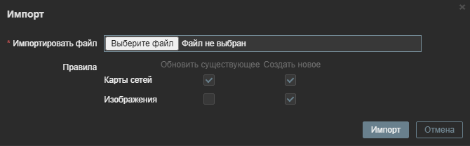 Если не отметить обе опции для карты сети и выбрать соответствующие опции для изображений, то только изображения будут импортированы. Импорт изображений доступен только пользователям Суперадминистратор.