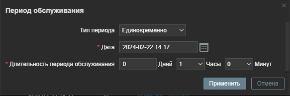 Окно периода обслуживания предназначен для планирования времени периодического или однократного обслуживания. Доступные поля окна меняются динамически на основе выбранного "Тип периода" (рисунок 133).