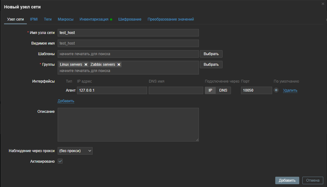 - Интерфейсы – IP-адрес. Для узла сети поддерживаются несколько типов интерфейсов: Агент, SNMP, JMX и IPMI. Хотя технически это поле не является обязательным, интерфейс узла сети необходим для получения определённых метрик. Для использования пассивных проверок, указывают в этом поле IP или DNS Агента. Следует обратить внимание, что необходимо указать IP-адрес или DNS-имя Сервера в файле конфигурации Агента в параметре "Server". Если Агент и Сервер установлены на той же машине, нужно указать те же IP/DNS в обоих местах.