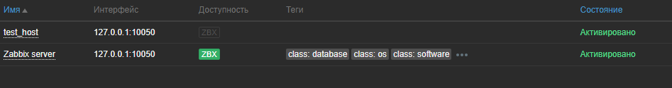 Колонка Доступность содержит индикаторы доступности узла сети по каждому интерфейсу. При выборе интерфейс Агента для понимания доступности узла сети можно использовать иконку доступности Агента (с подписью "ZBX"):