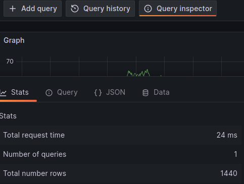 Чтобы получить подробную статистику по запросу нужно нажать "Query inspector (Инспектор)" (рисунок 10). Инспектор работает как своего рода инструмент отладки, который "проверяет" запрос, и предоставляет статистику запросов на вкладке "Stats (Статистика)", время отклика запроса – во вкладке "Query (Запрос)", сведения о фрейме данных в – "{} JSON" и форму данных – в "Data (Данные)".