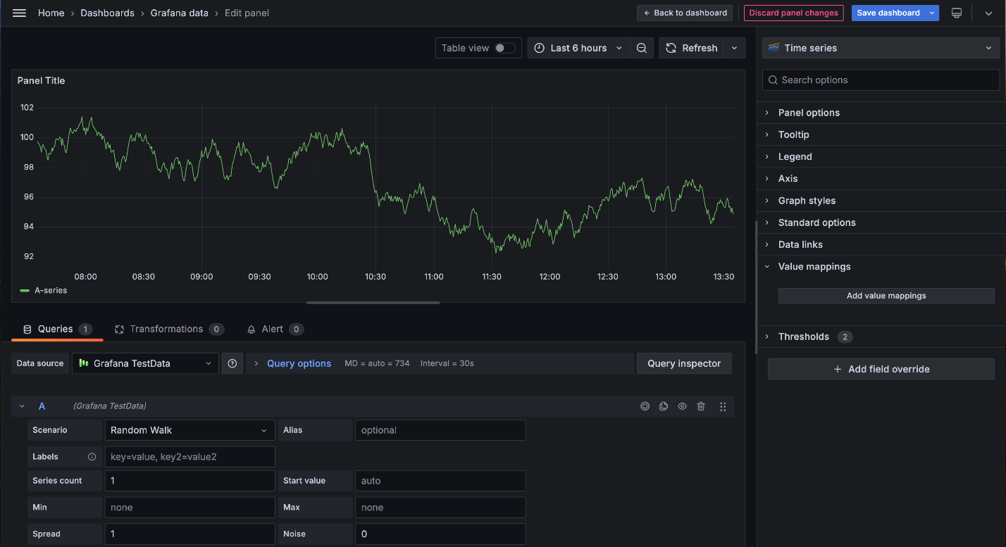 - Queries (Запросы) – выбрать источник данных и здесь же ввести запросы. При создании новой панели будет предложено выбрать источник данных до перехода в редактор панели. Можно установить или обновить источник данных в существующих панелях с помощью выпадающего списка на вкладке "Data source (Источник данных)";