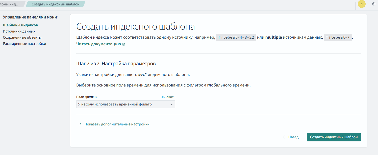 - выбрать @timestamp в раскрывающемся меню, чтобы указать поле времени, которое Подсистема будет использовать при фильтрации документов по времени. Выбор этого временного фильтра определяет, к какому полю применяется временной фильтр. Это может быть отметка времени запроса или любое другое поле с отметкой времени. Если не требуется использовать временной фильтр, следует выбрать "Я не хочу использовать временной фильтр" в раскрывающемся меню, при этом Подсистема вернет все данные в индексах, которые соответствуют шаблону (рисунок 48);