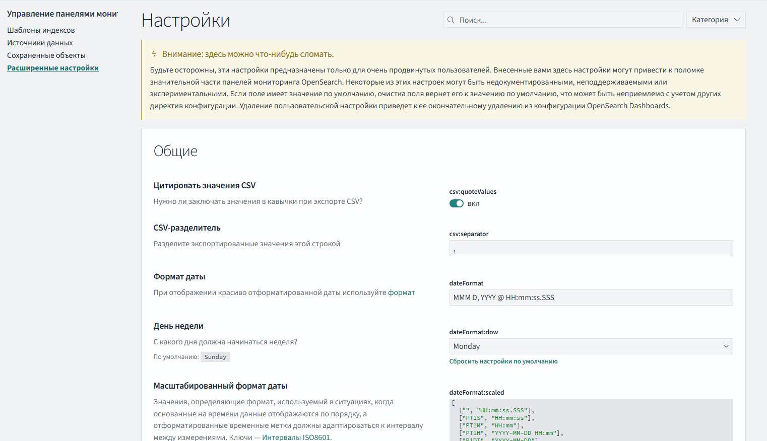 Примечание – Для некоторых настроек требуется изменить файл opensearch_dashboards.yml и перезапустить "Панели мониторинга".