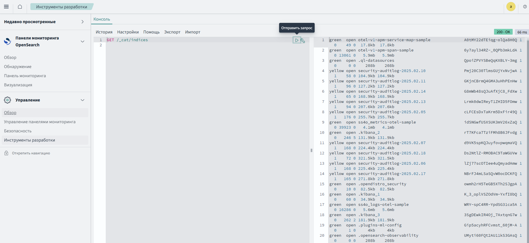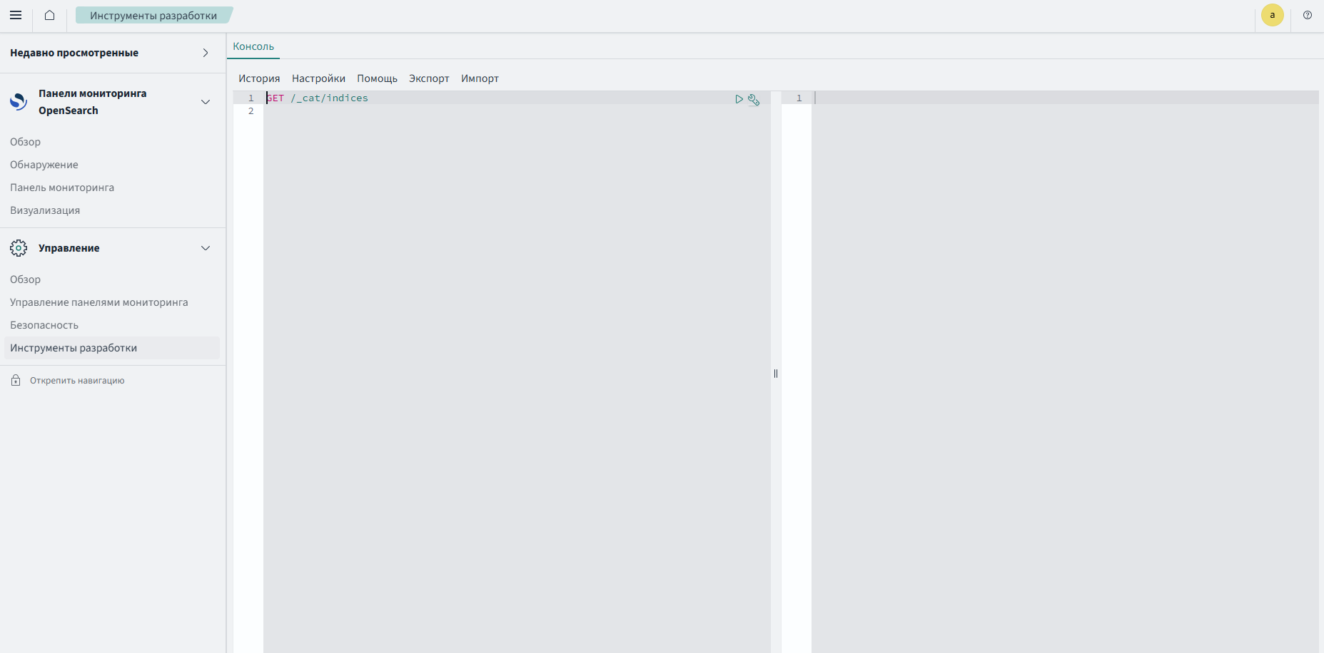 Чтобы писать запросы, используют панель редактора в левой части консоли. Чтобы отправить запрос, нужно выбрать его, поместив курсор в текст запроса, а затем нажав значок воспроизведения в правом верхнем углу запроса или нажав Ctrl/Cmd+Enter. Ответ от Подсистемы отображается в панели ответов в правой части консоли. Чтобы одновременно выполнить несколько команд, следует выбрать все команды в панели редактора, а затем нажать значок воспроизведения или нажать Ctrl/Cmd+Enter.