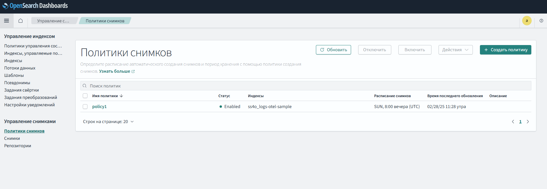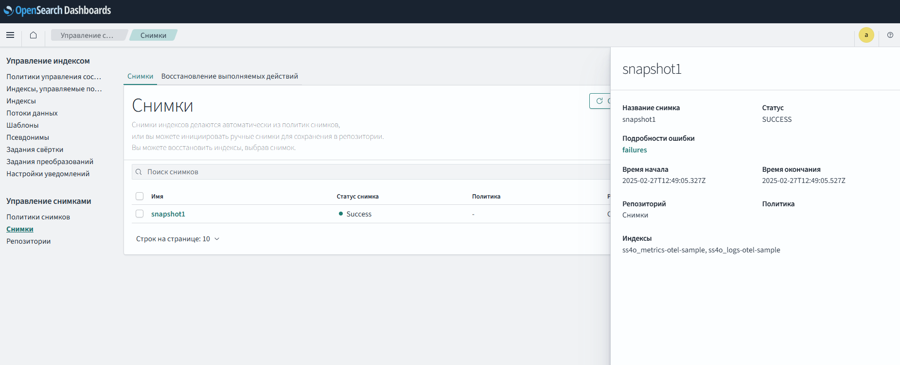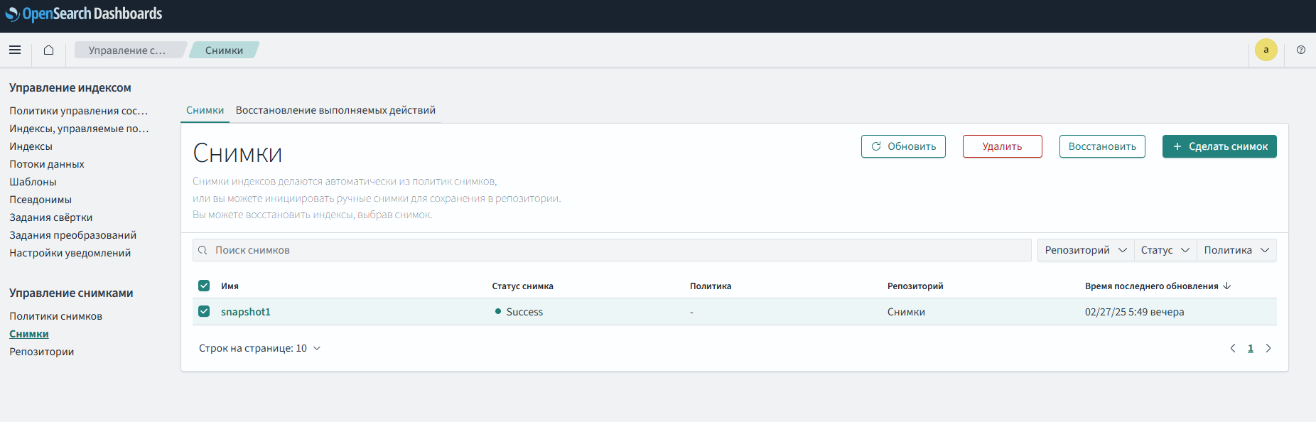 Снимки состояния — это резервные копии индексов и состояния кластера. Состояние включает в себя настройки кластера, информацию об узлах, метаданные индексов (сопоставления, настройки, шаблоны) и распределение сегментов. Интерфейс управления снимками "Панели мониторинга" предоставляет единое решение для создания и восстановления снимков состояния.