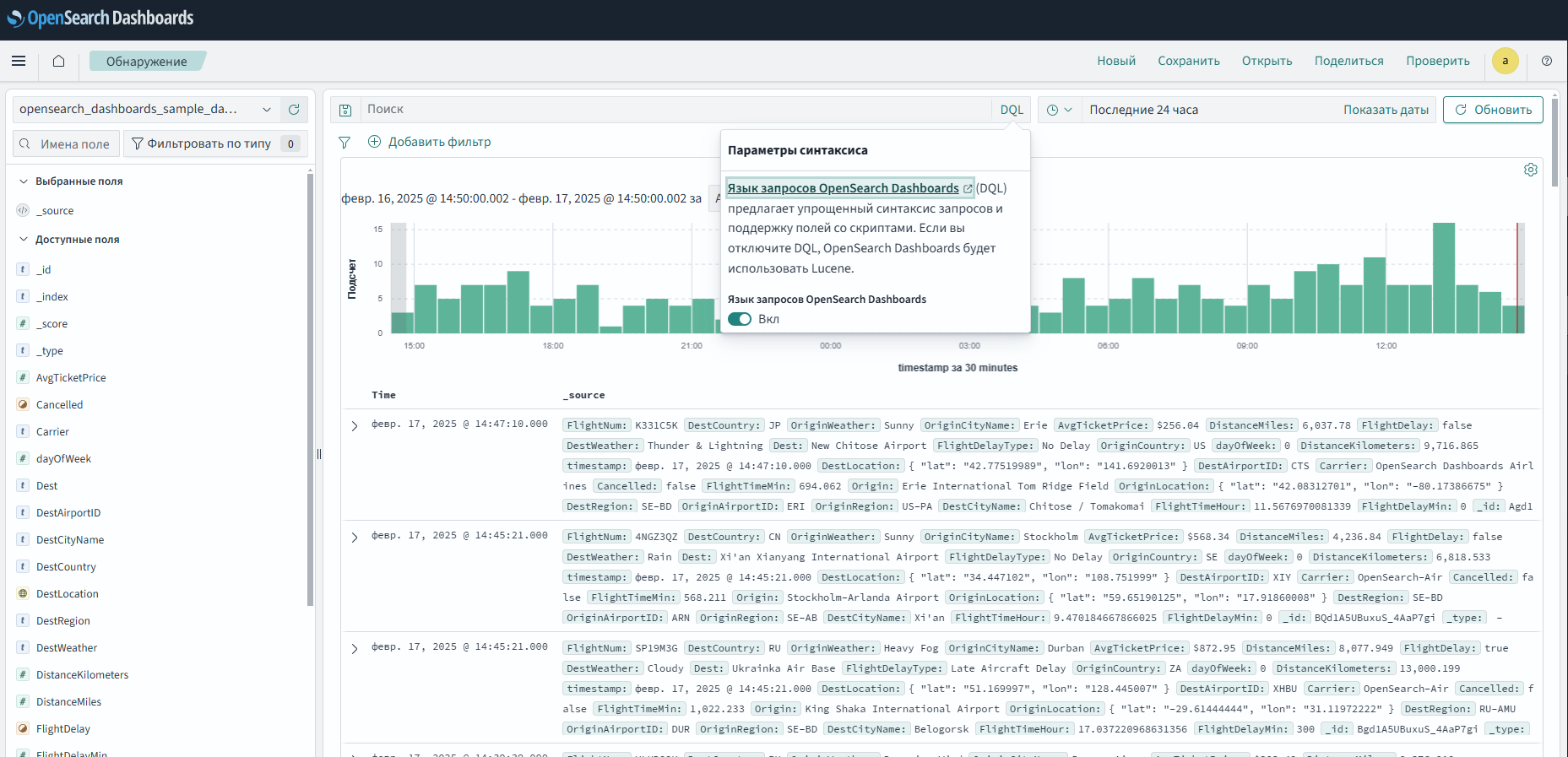 По умолчанию языком запросов на панели "Обнаружение" является DQL. Чтобы переключиться на синтаксис строки запроса, нужно выбрать "DQL", а затем отключить "Язык запросов OpenSearch Dashboards", убрав соответствующий флажок. Язык запросов изменится на строку запросов, как показано на рисунке 4.