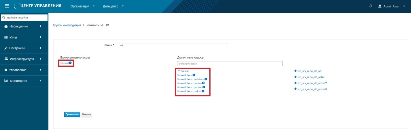 Пользователю предоставляется возможность одноэтапного метода привязки нескольких классов Puppet к узлу или к группе узлов. Для этого требуется выбрать классы во "Включенные классы" из перечня "Доступных классов", используя пиктограммы (плюс) и (минус). Далее нажимают кнопку Применить для сохранения изменений (рисунок 35).