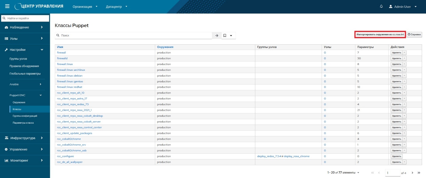 Для импорта класса нужно перейти в раздел "Настройки Puppet ENC Классы" и нажать кнопку Импорт окружений из … (рисунок 38). В результате будут импортированы только классы из модулей. Файлы манифестов Puppet должны быть валидными, чтобы их можно было разобрать с помощью агента Puppet. Для проверки синтаксиса файлов манифестов Puppet следует использовать команду: