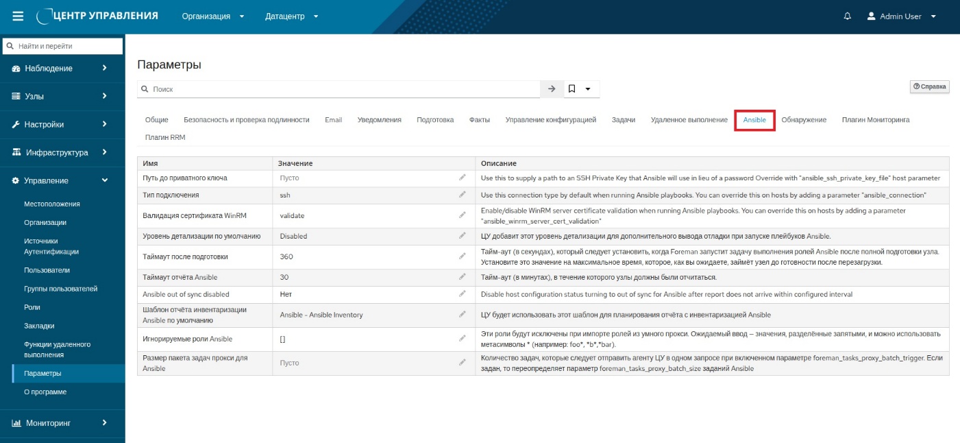 Интерфейс РОСА Центр управления предоставляет пользователю возможность для настройки следующих основных параметров Ansible: