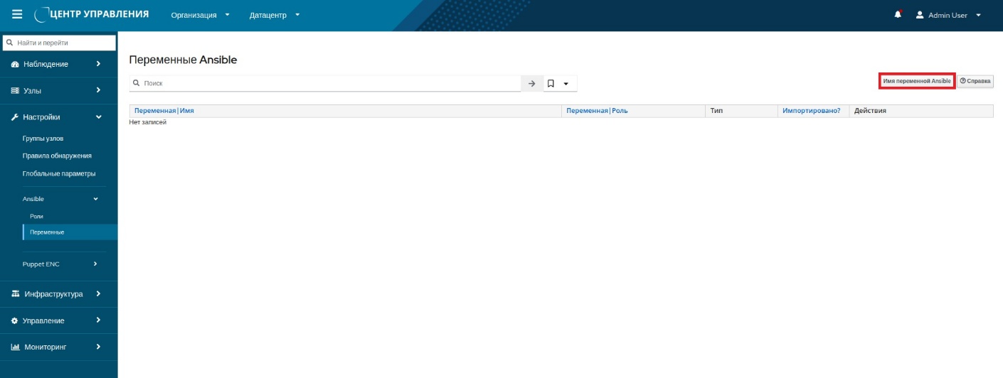 - Импорт переменных. Аналогично ролям, переменные внутри ролей можно импортировать таким же способом: перейти в меню "Настройки → Ansible → Переменные", чтобы увидеть список уже импортированных переменных. При запуске нового импорта переменных Ansible, если переменные принадлежат роли, которая еще не была импортирована, она будет автоматически импортирована вместе с переменными Ansible.