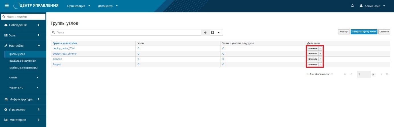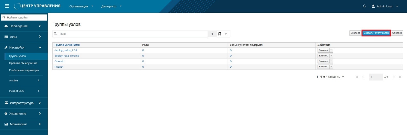 - перейти в меню "Настройки → Группы узлов" панели навигации и нажать в рабочей области кнопку Создать группу узлов.
