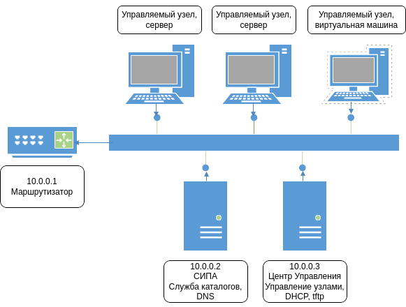 РОСА Центр управления функционирует в своей локальной подсети в качестве сервера DHCP и TFTP, назначает управляемым узлам IP-адреса, передает сетевые настройки, обеспечивает сетевую загрузку и установку ОС, а в качестве маршрута по умолчанию РОСА Центр управления назначает узлам IP-адрес маршрутизатора (например, 10.0.0.1).